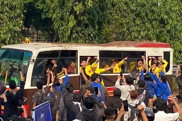 Tak lama berselang, sekitar pukul 15.25 WIB, sejumlah bus yang mengangkut mahasiswa UI terlihat masuk melalui gerbang Polda Metro Jaya di dekat Halte TransJakarta kawasan Semanggi. Mahasiswa dengan jas kuning itu melambaikan tangan ke arah rekan-rekan mereka yang sudah lebih dulu berada di depan gerbang.